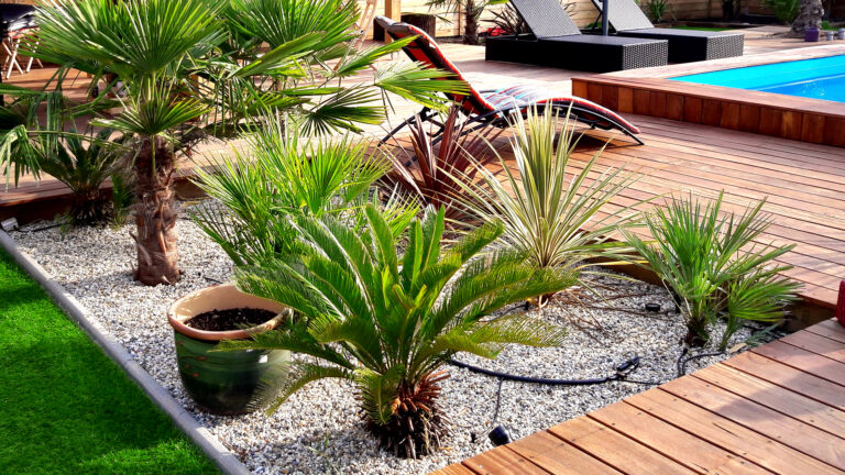 Le bois (teck, pin traité, composite) reste un choix classique et chaleureux pour une terrasse paysagère. Il s’intègre parfaitement dans un cadre méditerranéen.